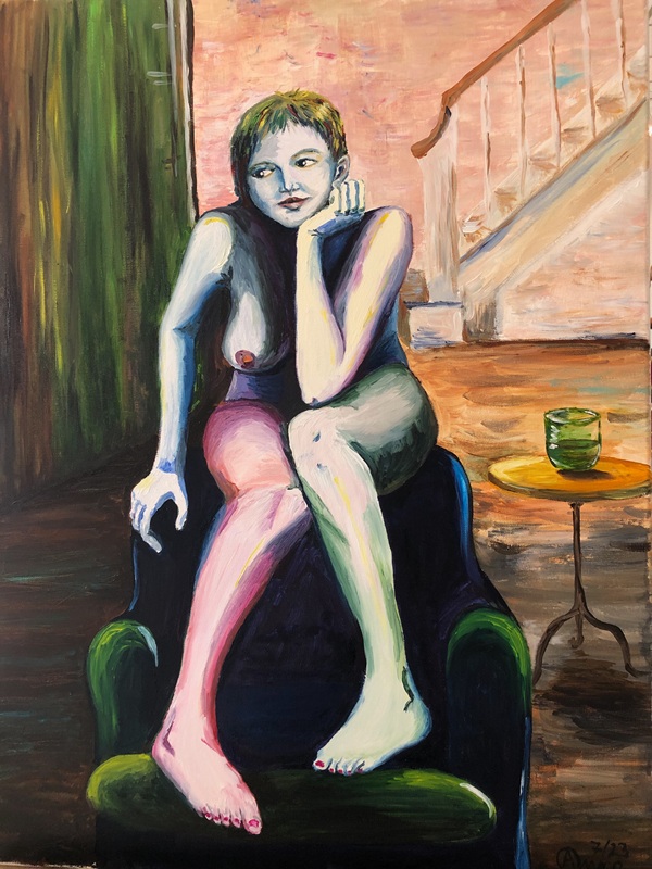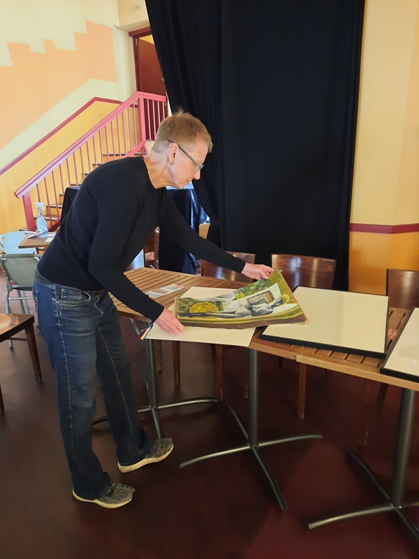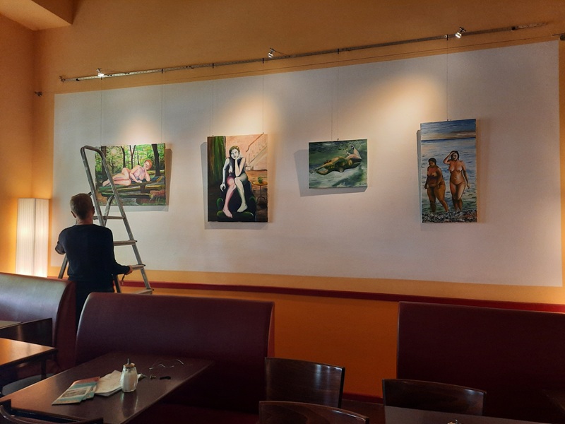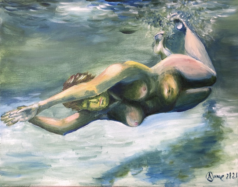Sie malt seit ihrer Kindheit. Sie ist von Menschen und ihren Gesichtern fasziniert. Nach einer langen Pause als Künstlerin, findet sie zu ihrer früheren Leidenschaft zurück. Sie probiert vorsichtig und neugierig aus, ob sie überhaupt noch malen kann. So entsteht das Bild „Die Schwimmerin“ in dem sie faszinierend die Bewegungen der eintauchenden Frau auffängt.