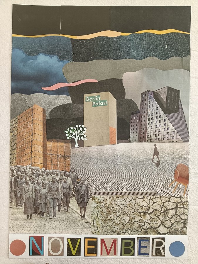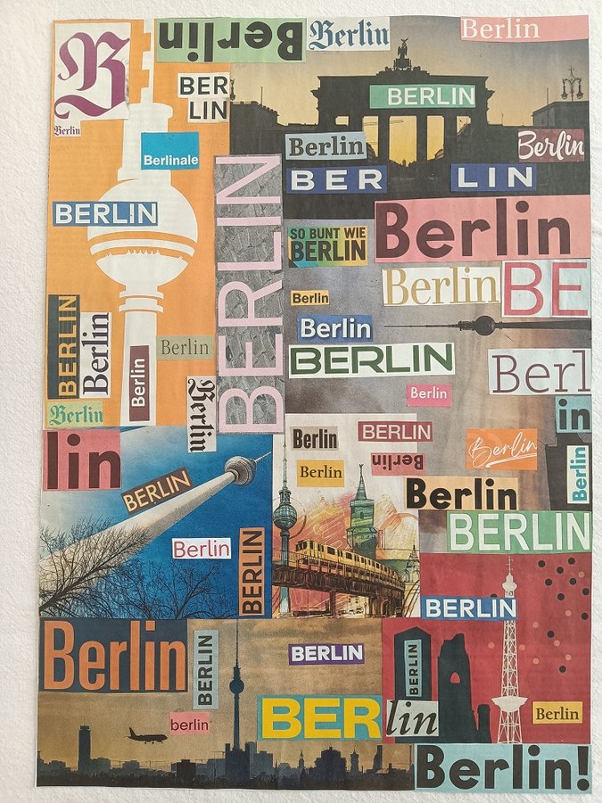 Auf ironische und spielerische Art und Weise erzählt Evamaria, was sie beschäftigt, interessiert, was ihr Sorgen bereitet und was sie witzig findet. Auf dem ersten Blick scheinen die bunten Collagen lustig zu sein. Beim längeren Betrachten sehen wir, dass die Themen, von denen sie erzählen, ernst und sogar besorgniserregend sind, wie bei den Collagen: Klimawandel und Ausflug an`s Meer. Der Blick der Künstlerin auf die Welt und Gegenwart ist scharf und ironisch. Mit Schere, Klebstoff und Papier experimentiert sie mit Farben, Bildern und Texten. Damit erschafft sie neue Welten, neue Zusammenhänge und Erkenntnisse.