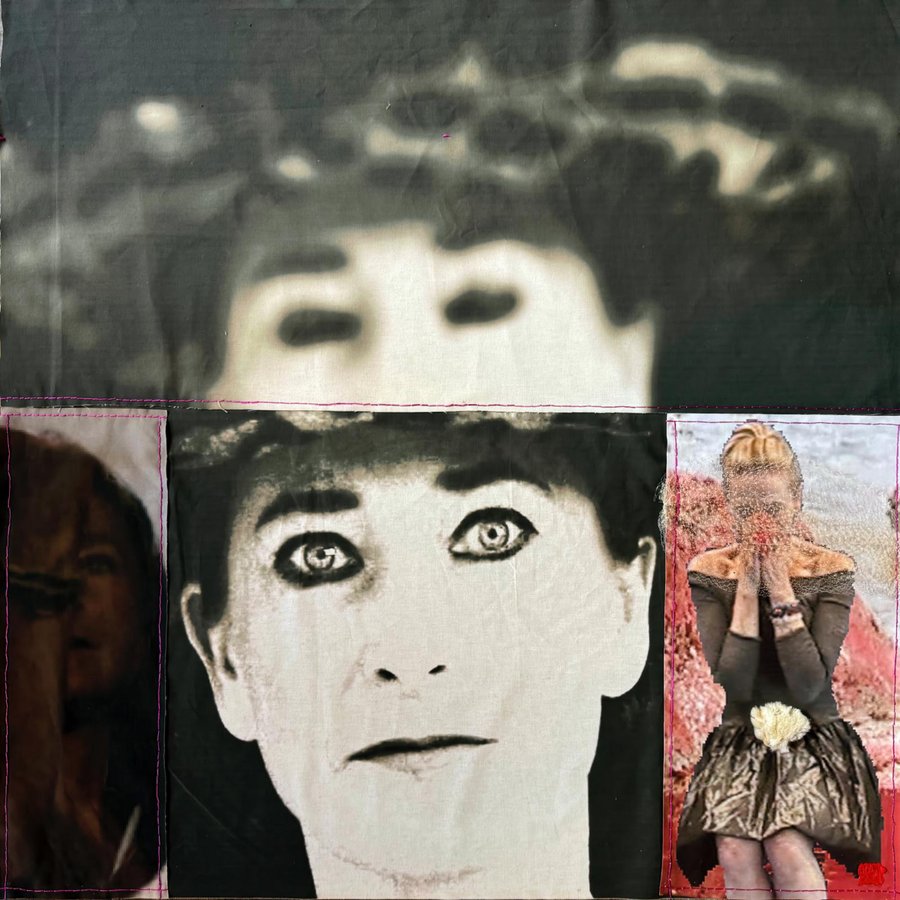 Venus weint heimlich; Abbildung der Montage von auf Canvas gedruckten Stills aus den Videos Chère maman (2004), Welche Nahrung gibst du deiner Seele (2006), Kopflast (2012), mit Fell und Netz ergänzt.
