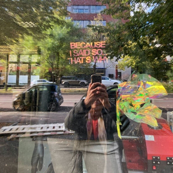 Bruchstückhaft und scheinbar beliebig fügen sich die Bildelemente zu einer collagenartigen Komposition zusammen. Innen- und Außenräume verschmelzen, auf den ersten Blick ununterscheidbar, ineinander. Fast wie betend hält mein Spiegelbild das Handy in die Höhe, um das Bild fotografisch festzuhalten, das sich um den Text „BECAUSE I SAID SO THAT´S WHY“ herumgruppiert.