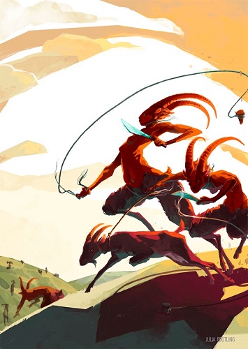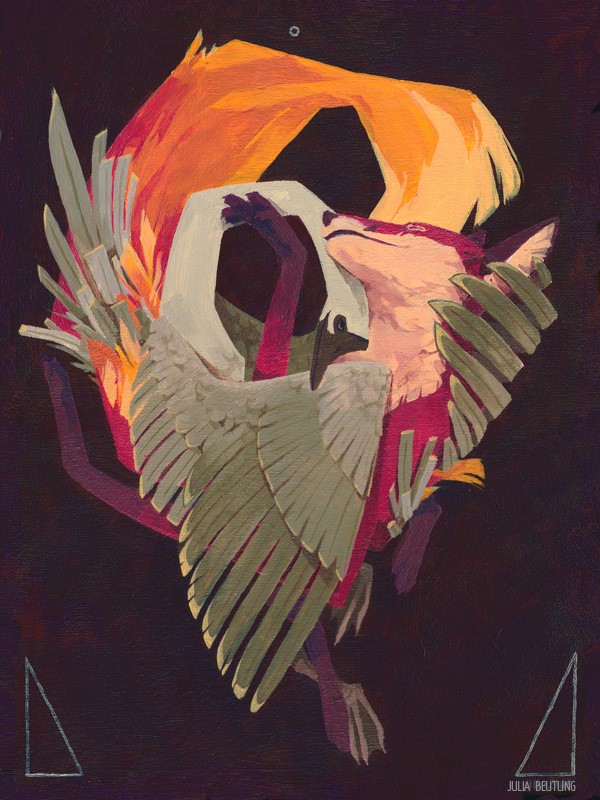 Julia Beutling ist eine Berliner Illustratorin, die stilisierte und farbenfrohe Welten voller Tiere und Mischwesen erschafft. Darin erzählt sie immer auch etwas über Menschen und ihre Beziehung zu der belebten Welt um sie herum. Ihre Bilder sind positiv mit einem Hauch Dunkelheit und zeigen sich stets solidarisch mit den nichtmenschlichen Lebewesen.