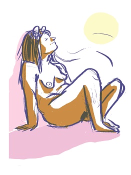Auf ihren Bildern zeigt Sabina Frauen, die ihren Körper akzeptieren und dadurch frei und mutig sich fühlen. Die Bilder mit ihren kräftigen, entschlossenen Linien und einfachen Farbflächen strahlen Selbstsicherheit und Lust zur spielerischen Provokation aus. Die Künstlerin schmunzelt zu uns und wartet auf unsere Reaktion. Freundschaftlich. Mit Sympathie. Wie das soeben unter guten Freundinnen ist.