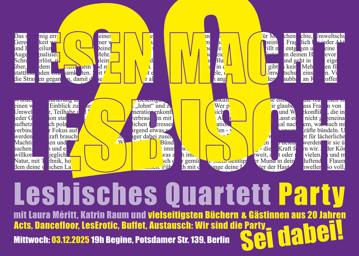 Das Lesbische Quartett feiert 20jähriges! Das zelebrieren wir mit einer ganz besonderen Lese-Sause: Gästinnen und Autorinnen aus 20 Jahren bringen ihre Lieblingsbücher mit und feiern mit uns. Mit Laura Méritt, Katrin Raum und vielseitigsten Bücher & Gästinnen aus 20 Jahren! Acts, Dancefloor, LesErotic, Buffet, Austausch: Wir sind die Party!